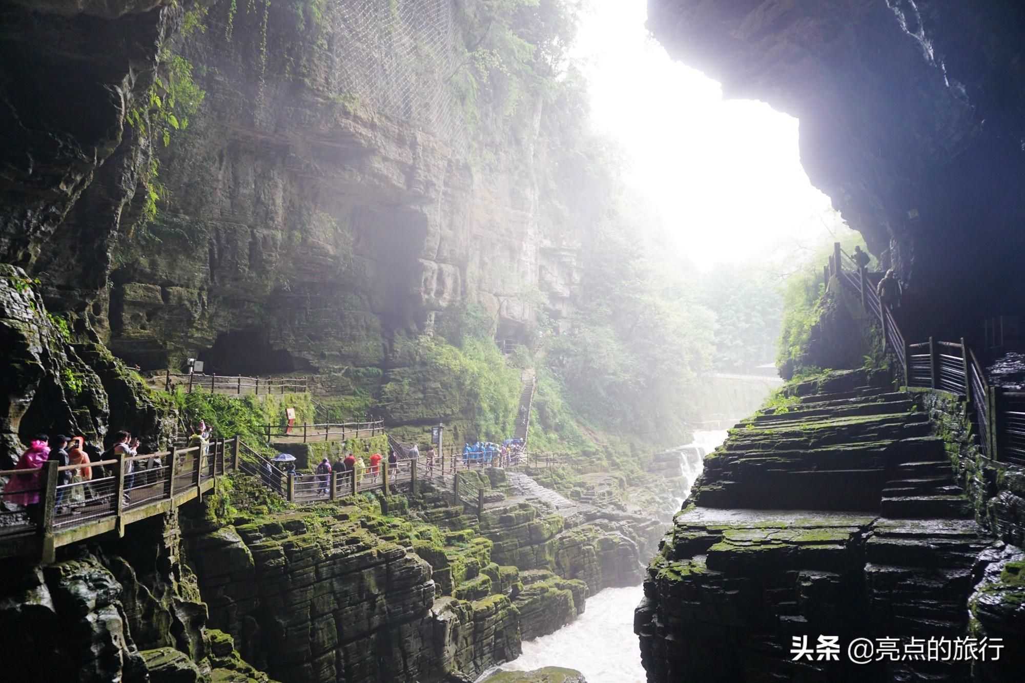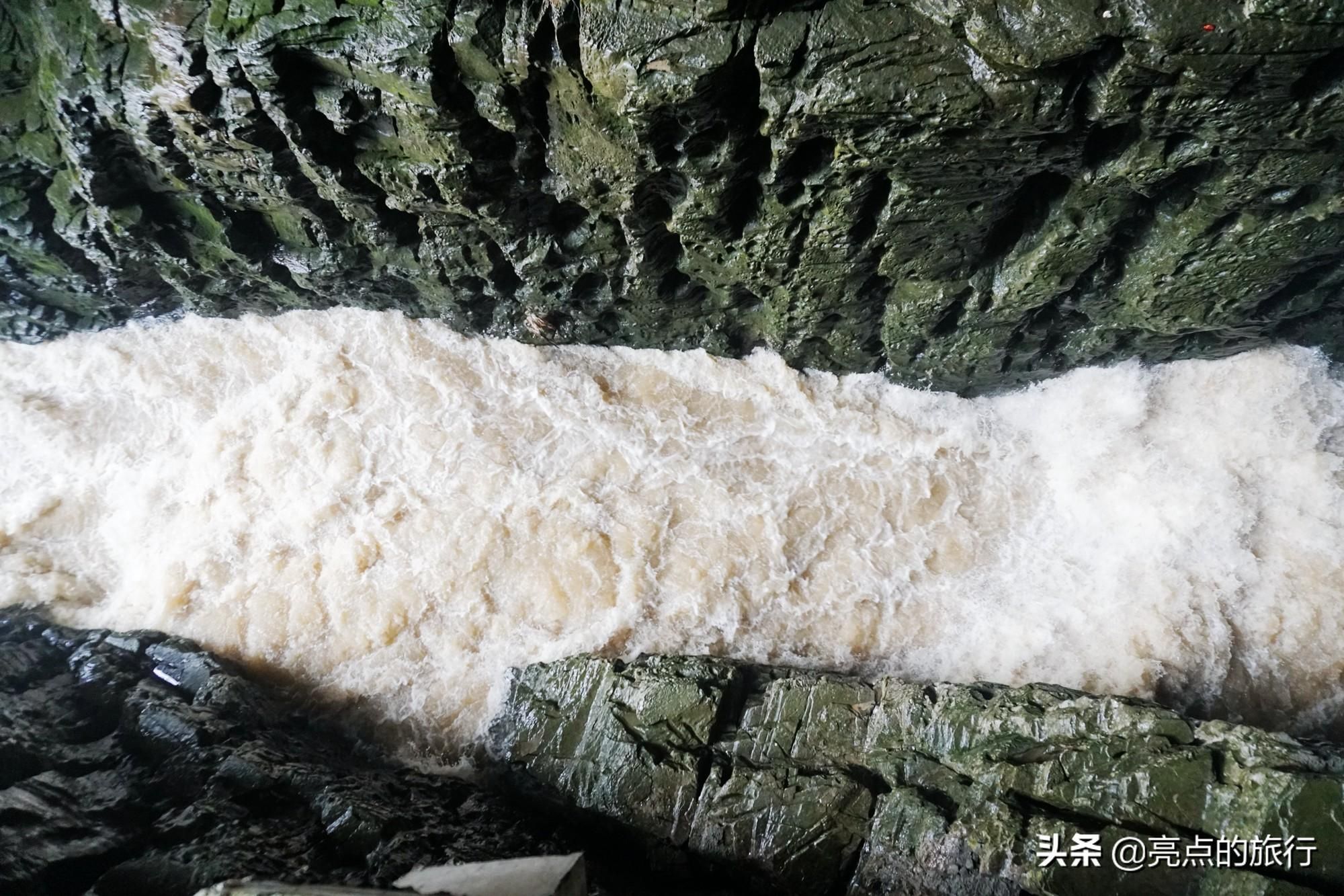 站在上面往洞口看,可见浩浩荡荡的江水直落,瀑布入口恰似一条卧龙张开巨嘴吞吸清江水,形成了“卧龙吞江”的壮丽景观,其壮观程度可以媲美壶口瀑布,清江水至此变成长16.8公里的地下暗流。