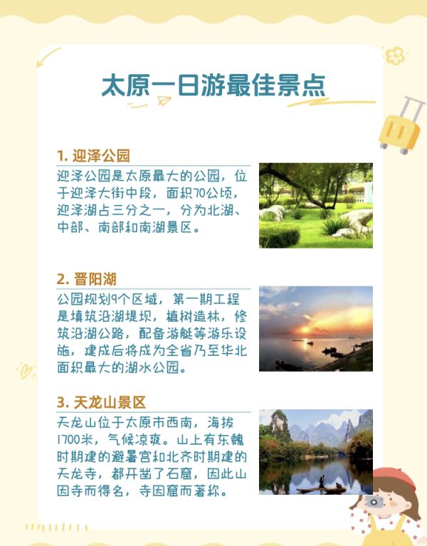 旅游不仅仅是看风景,更是体验生活。在这一日游中,你不仅会看到太原的美丽风景,还会感受到太原的生活气息,体验到太原人民的热情好客。你会在旅行中找到生活的乐趣,你会发现旅行可以让生活更加丰富多彩。