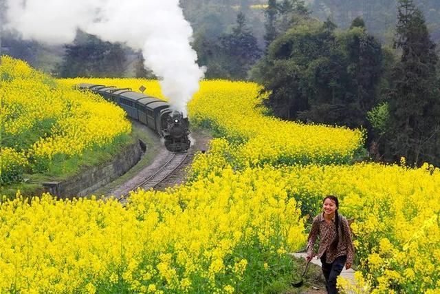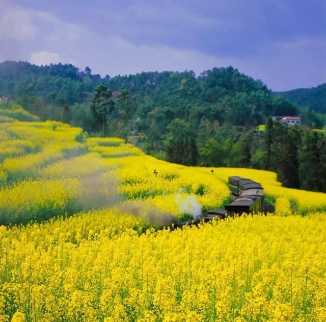 那辆冒着白烟、鸣着汽笛的标志性小火车,每天都欢快地从坡地上的油菜花丛中奔驰而来。