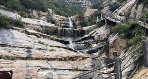 卢崖寺北的峡谷内,有一股泉水,终年不断,平时泉水泻崖而下,好似千丈珠帘高挂长空。水珠积流,形成水潭,潭上突出一个黛色圆石,明朝袁宏道在上面刻有“墨浪石”三个大,水流其上,好似墨浪。人称此景为“卢崖瀑布墨浪流”,亦称为“珍珠倒卷帘”。
