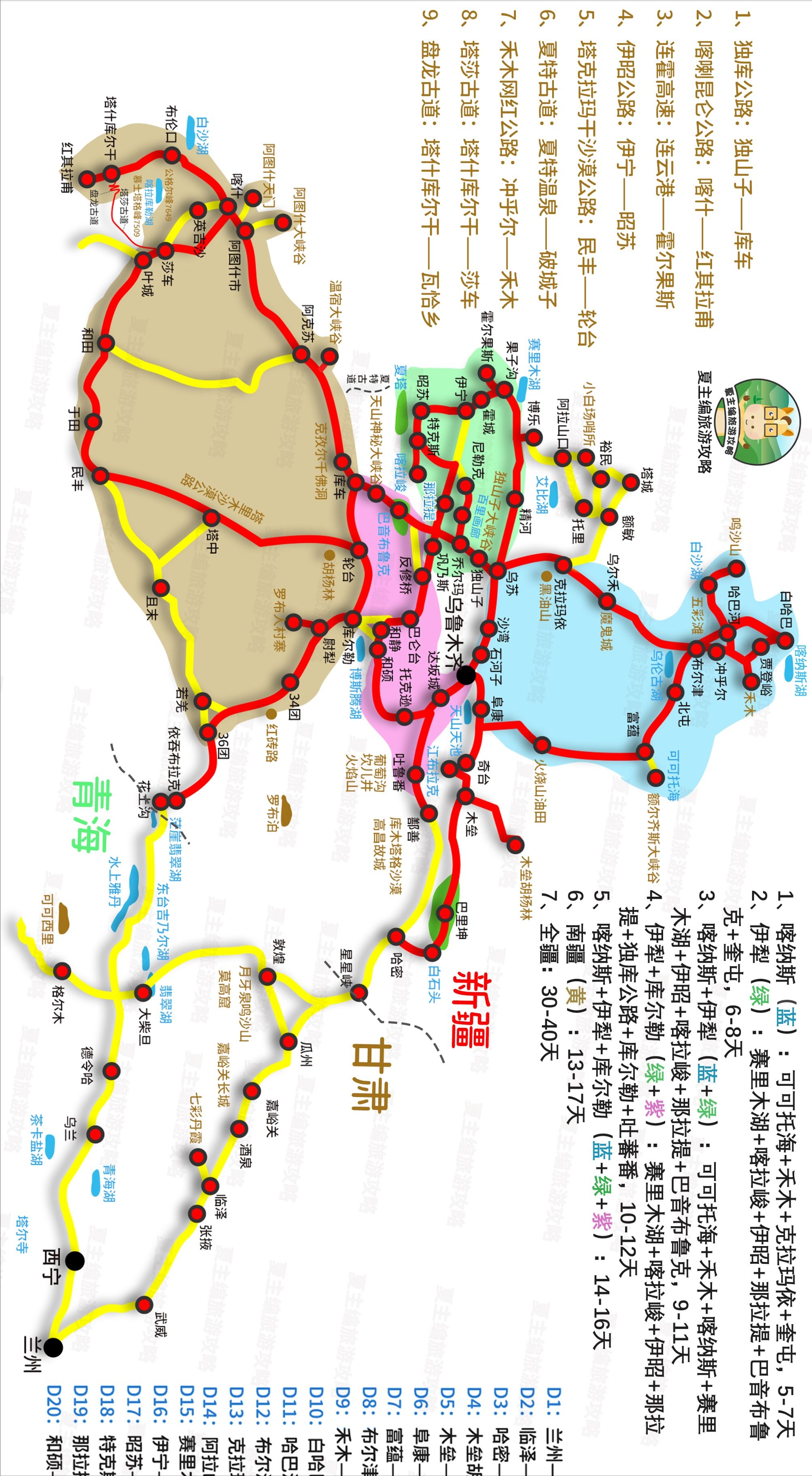 以上线路,每一条都编写有详细【路书】,内容包含【日程规划、住宿地、景点安排、注意事项】等信息。其余【海拔、路况、加油、费用明细、最佳游玩时间】等旅游信息,【专栏】都有详细说明。