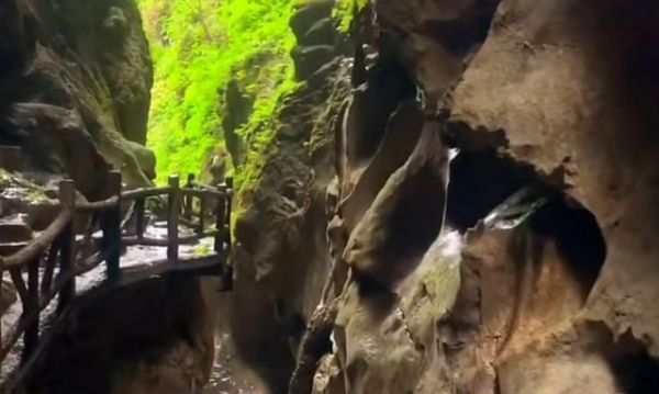 鬼谷峡洞,地处张家界市城区南侧,背靠天门山,脚临澧水河,鬼谷峡洞通道窄逼,最宽处不超过3米,最窄处仅有1.5米。亿万年前地裂缝形成了峡洞,全长两里。两岸绝壁,异石倒挂,天见一线,峡洞冬暖夏凉,洞穿溪流来自天门,源头活水湍急欢快。