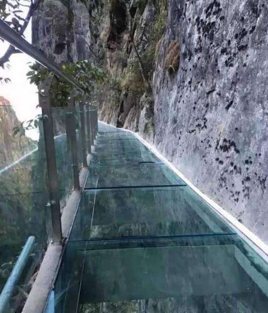 神潭大峡谷玻璃栈道在离景区入口不远的地方,栈道离地面垂直距离达到150米,全长有2000米,站在山底向上看,一眼望不到尽头。