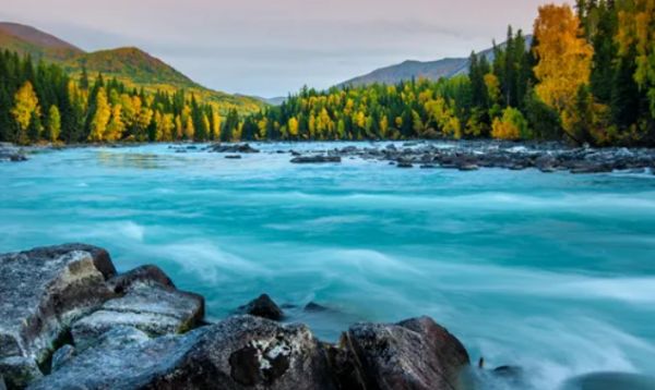 喀纳斯河是布尔津河的主要支流,河的上源就是喀纳斯湖。湖水倾泻而下,在山谷中蜿蜒,形成了卧龙湾、月亮湾等秀丽绝伦的水湾河滩。喀纳斯湖南端出水口以下到鸭泽湖的河段巨石密布,水流湍急,浪花四溅;鸭泽湖到卧龙湾河段,则河面宽阔,水流缓慢,河滩上绿草如茵,两岸林木葱郁。