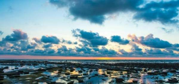 景区内长达约1.5公里的海岸几乎都发育着20-50米高的海蚀崖,崖面耸立,蔚为壮观。退潮时的五彩滩,可以见到一层又一层的海蚀沟,在阳光的照耀下,十分漂亮。