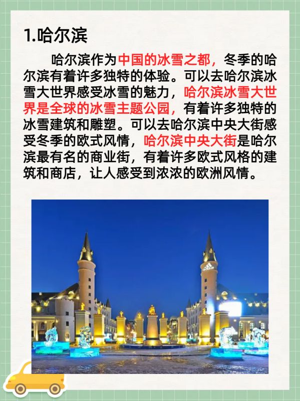 哈尔滨作为中国的冰雪之都,冬季的哈尔滨有着许多独特的体验。可以去哈尔滨冰雪大世界感受冰雪的魅力,哈尔滨冰雪大世界是全球的冰雪主题公园,有着许多独特的冰雪建筑和雕塑。可以去哈尔滨中央大街感受冬季的欧式风情,哈尔滨中央大街是哈尔滨最有名的商业街,有着许多欧式风格的建筑和商店,让人感受到浓浓的欧洲风情。