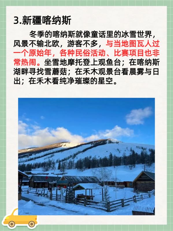 冬季的喀纳斯就像童话里的冰雪世界,风景不输北欧,游客不多,与当地图瓦人过一个原始年,各种民俗活动、比赛项目非常热闹。坐雪地摩托登上观鱼台;在喀纳斯湖畔寻找雪蘑菇;在禾木观景台看晨雾与日出;在禾木看纯净璀璨的星空。