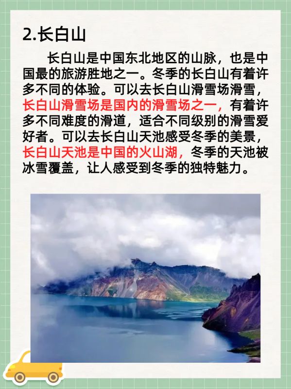 长白山是中国东北地区的山脉,也是中国最的旅游胜地之一。冬季的长白山有着许多不同的体验。可以去长白山滑雪场滑雪,长白山滑雪场是国内的滑雪场之一,有着许多不同难度的滑道,适合不同级别的滑雪爱好者。可以去长白山天池感受冬季的美景,长白山天池是中国的火山湖,冬季的天池被冰雪覆盖,让人感受到冬季的独特魅力。