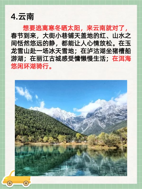 想要逃离寒冬晒太阳,来云南就对了,春节到来,大街小巷铺天盖地的红、山水之间恬然悠远的静,都能让人心情放松。在玉龙雪山赴一场冰天雪地;在泸沽湖坐猪槽船游湖;在丽江古城感受慵懒慢生活;在洱海悠闲环湖骑行。