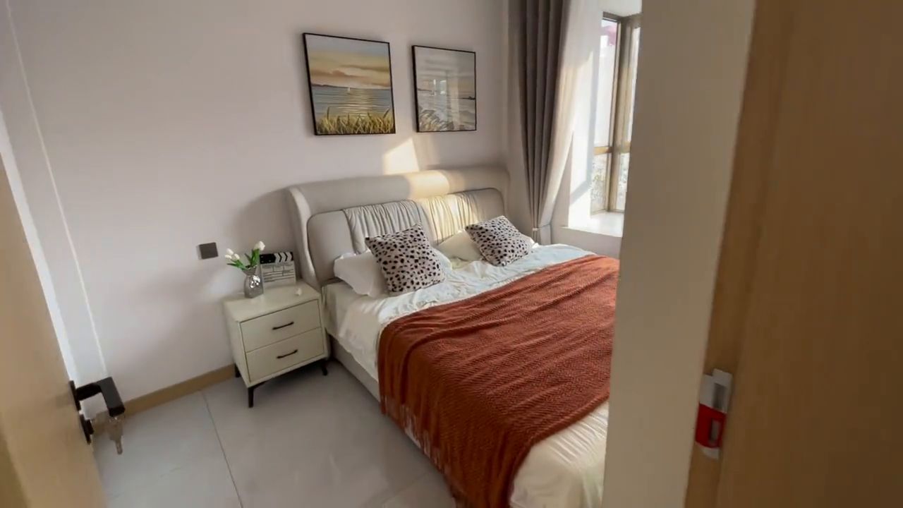 先看一下客厅,客厅是四米乘五米的大开间,南侧有一个阳台,这里预留了上下水,可以放洗衣机。先看一下南侧的主卧室,主卧室放了一个一米八乘两米的床,打造的衣柜,衣柜打造好了,带了一个飘窗。这是南侧的卧室。再来看一下北侧的卧室,北侧的卧室业主自己可以放一张床,放个一米五的床都可以。
