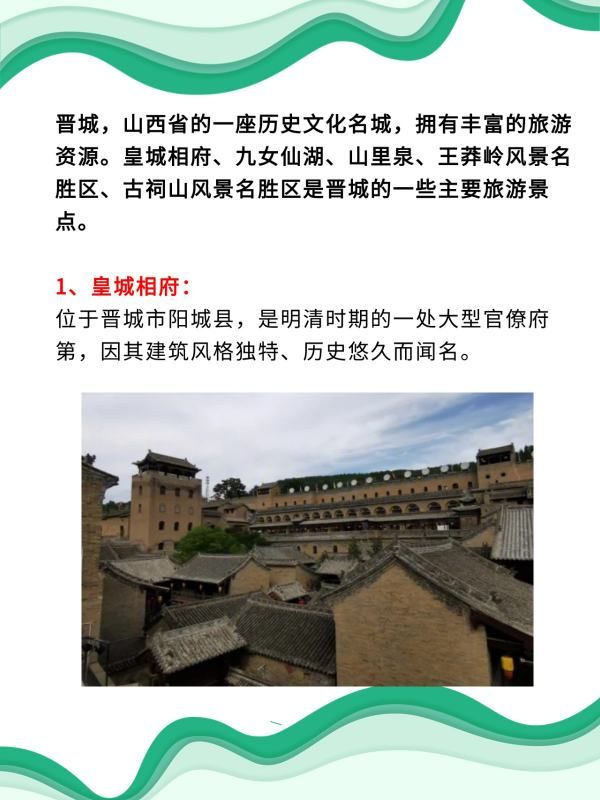 晋城,山西省的一座历史文化名城,拥有丰富的旅游资源。皇城相府、九女仙湖、山里泉、王莽岭风景名胜区、古祠山风景名胜区是晋城的一些主要旅游景点。