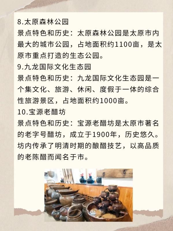 景点特色和历史:宝源老醋坊是太原市著名的老字号醋坊,成立于1900年,历史悠久。坊内传承了明清时期的酿醋技艺,以高品质的老陈醋而闻名于市。