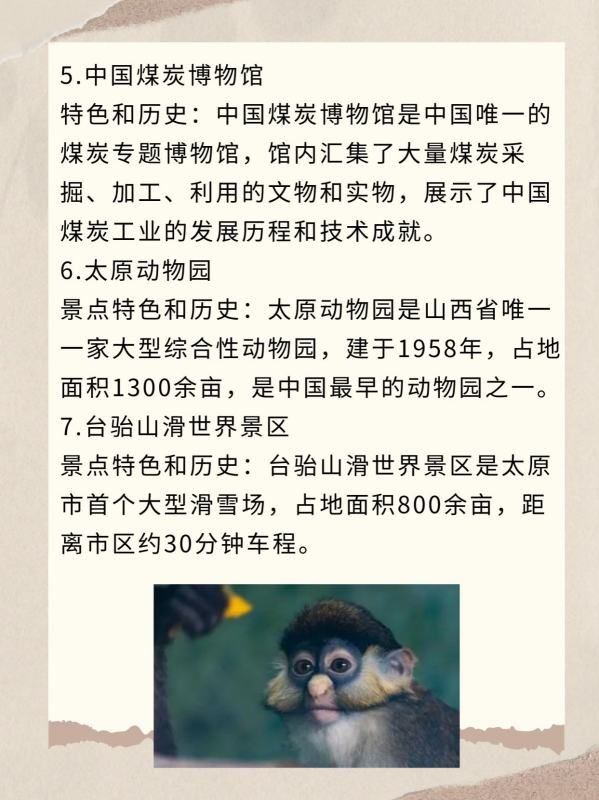 景点特色和历史:太原动物园是山西省唯一一家大型综合性动物园,建于1958年,占地面积1300余亩,是中国最早的动物园之一。