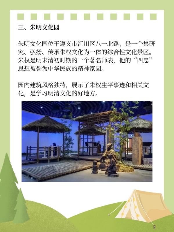 朱明文化园位于遵义市汇川区八一北路,是一个集研究、弘扬、传承朱权文化为一体的综合性文化景区。朱权是明末清初时期的一个著名师表,他的“四忠”思想被誉为中华民族的精神家园。