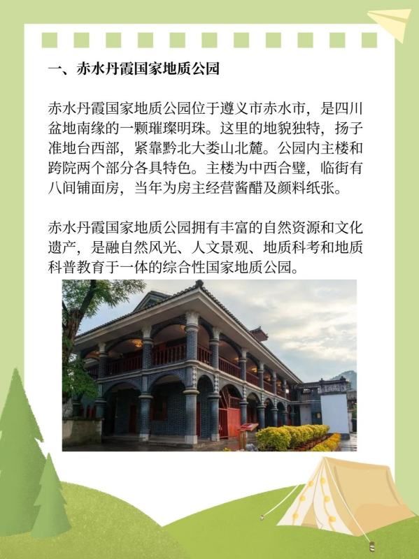 赤水丹霞国家地质公园拥有丰富的自然资源和文化遗产,是融自然风光、人文景观、地质科考和地质科普教育于一体的综合性国家地质公园。