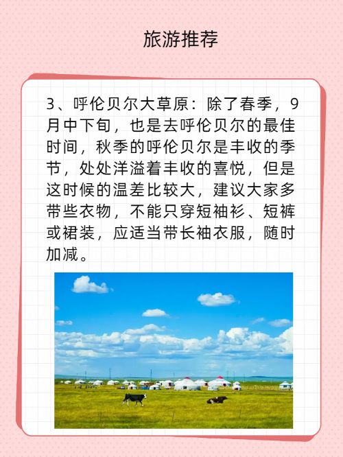 3、呼伦贝尔大草原:除了春季,9月中下旬,也是去呼伦贝尔的最佳时间,秋季的呼伦贝尔是丰收的季节,处处洋溢着丰收的喜悦,但是这时候的温差比较大,建议大家多带些衣物,不能只穿短袖衫、短裤或裙装,应适当带长袖衣服,随时加减。