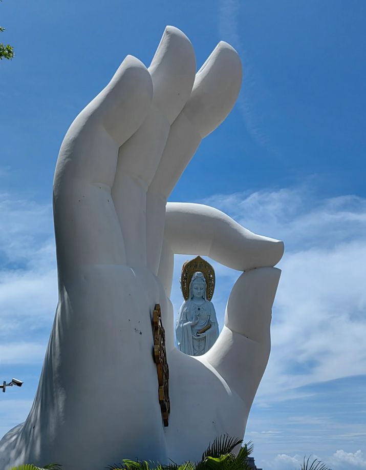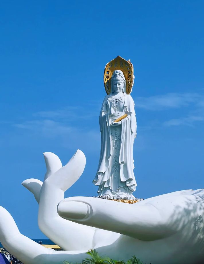 我最喜欢的是南海观音,这是一座108米高的海上观音像,是世界上最高的观音像,站在它的脚下,我感觉自己很渺小,但也很安心,仿佛有一种无形的力量在保佑着我。