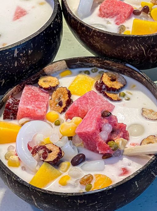除了海鲜,我还吃了很多三亚的特色小吃,比如酸糕、红糖糍粑、椰丝长粑、红糖年糕、地瓜糕、地瓜馍、椰丝糕、椰蓉卷、酱爆虾饼、椰子冻、清补凉、鸡屎藤、鲜果炒冰、椰子饭等等