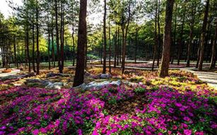 花园内万千马尾松汇成万顷林海,凉风徐徐。松林下掩映着特有的喀斯特地貌,嶙峋起伏,奇石兀立,森林、奇石、鲜花、草地相映成趣。