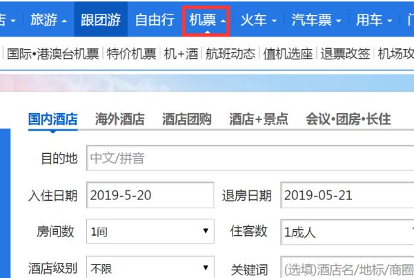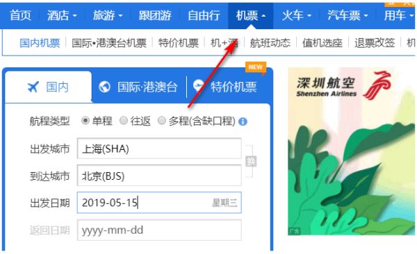 6、以国内航班为例,在机票分页下选择国内机票预订,如下图所示;