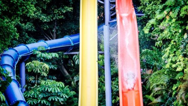 三、水上乐园水上乐园是主题公园的一种,多数娱乐设施与水有关,常见设施有:水滑梯、造浪设备、漂流河、戏水小品、滑板冲浪、互动水屋。