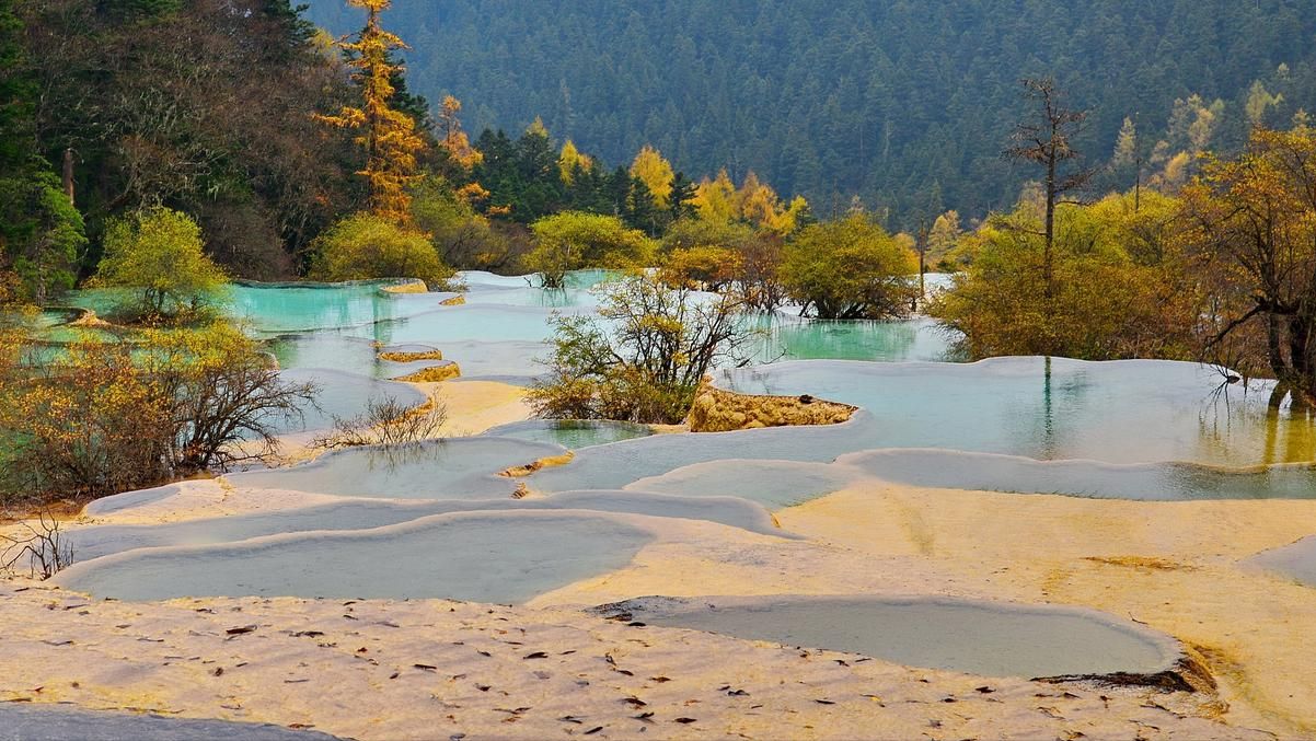 走进黄龙风景区,首先映入眼帘的是那一片片错落有致的彩池。彩池形态各异,色彩斑斓,宛如一颗颗璀璨的宝石镶嵌在山谷之中。在阳光的照耀下,池水熠熠生辉,美不胜收。