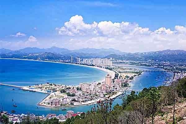 双月湾因为形状像两弯新月,因而取名双月湾,双月湾一共分为左右两湾,左湾水平如镜,右湾波涛汹涌。沙滩连绵20公里,沙滩宽约200米。海水清澈见底,海底平坦舒缓,人们可以站在海中,非常有趣。