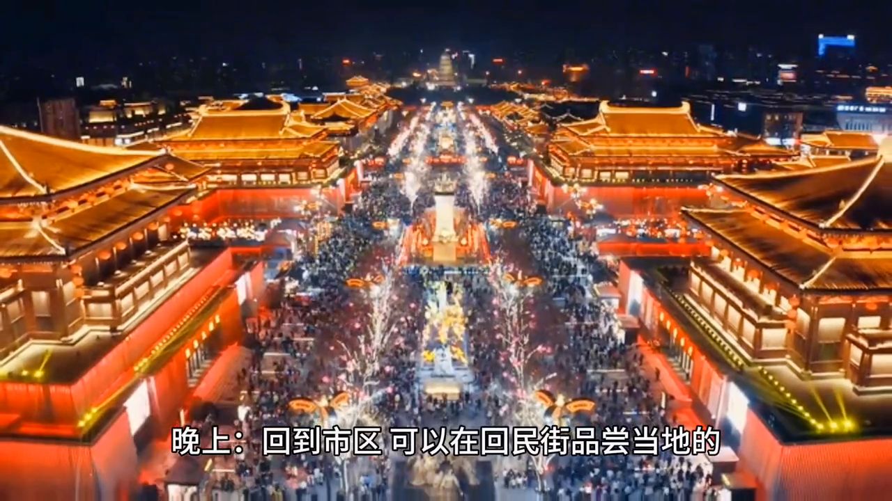 →晚上:回到市区可以在回民街品尝当地的美食和购买一些特色纪念品。