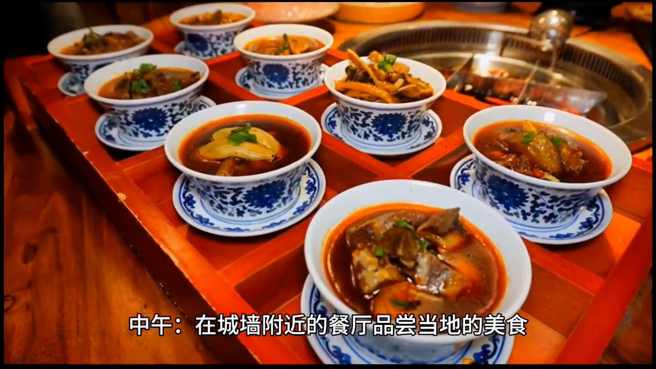 →中午:在城墙附近的餐厅品尝当地的美食,如裤带面、葫芦鸡等。