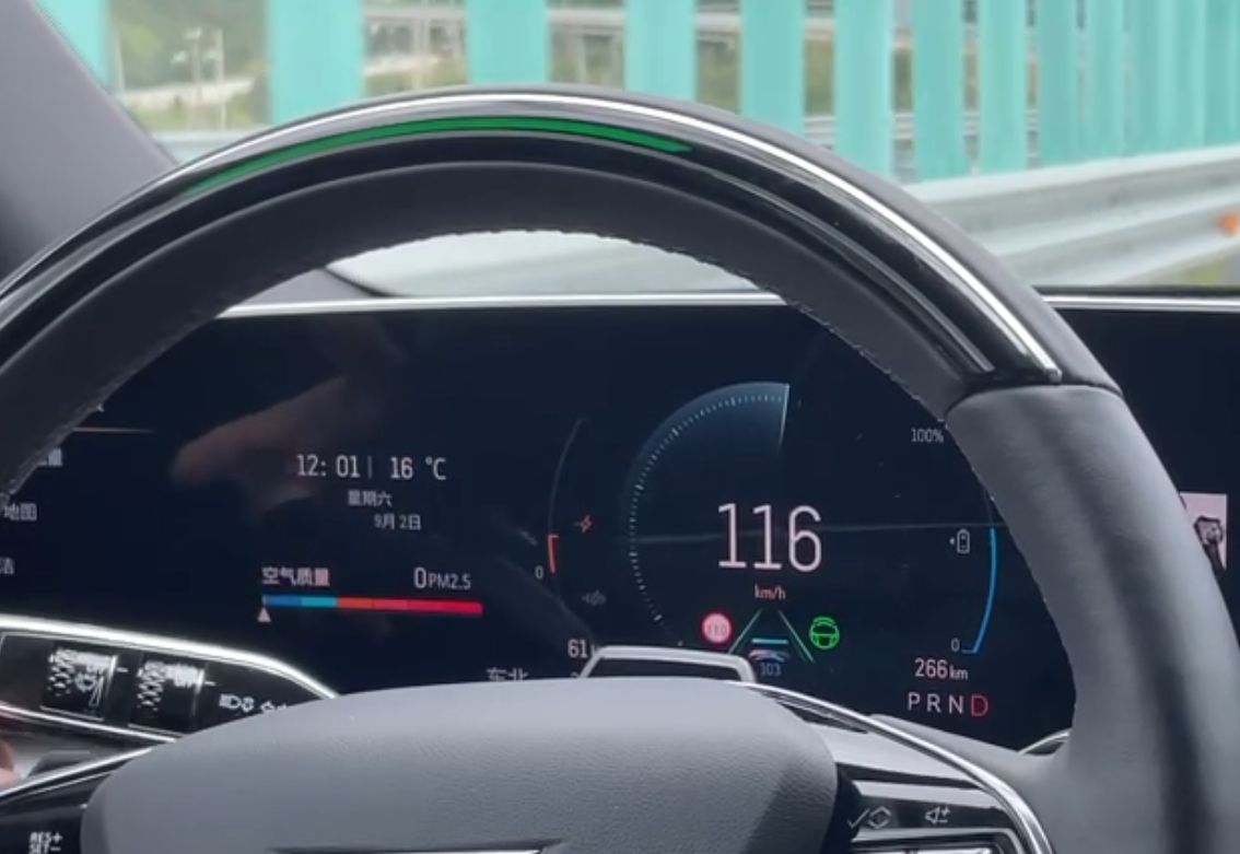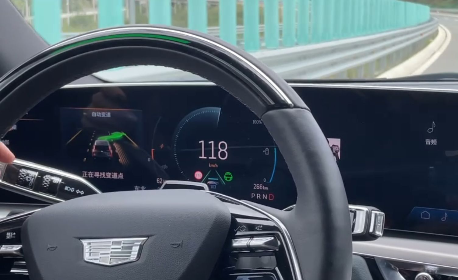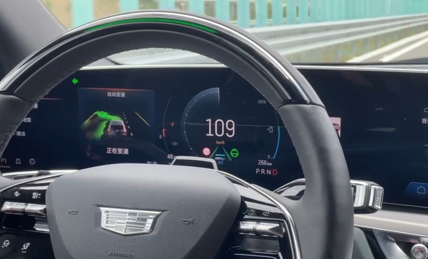 这儿说一个我实际体验中的细节,由于光线比较强,所以启动SUPER CRUISE开高速的时候我带了墨镜,中间有段时间可能是顾着和同行的老师聊天了,DMS驾驶员监测系统监测到我的眼神离开了路面,如是退出了SUPER CRUISE,此时方向盘上的灯带颜色也从绿色变为了红色,于是赶快接管方向盘(此处提醒大家开车切记注意安全)。