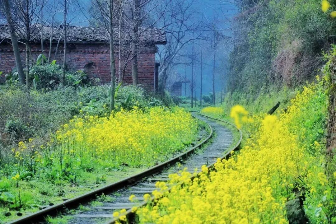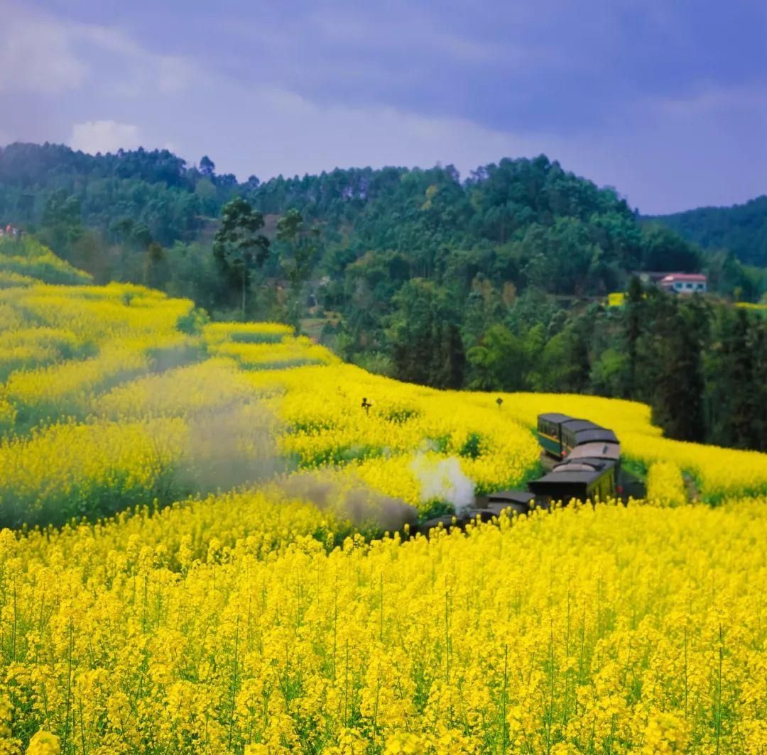 那辆冒着白烟、鸣着汽笛的标志性小火车,每天都欢快地从坡地上的油菜花丛中奔驰而来。