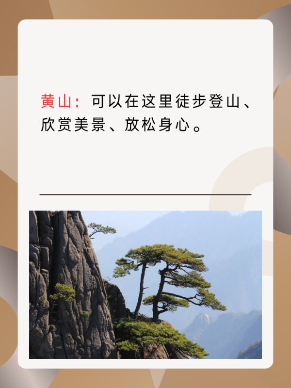 黄山:黄山是一个风景秀丽的山脉,有着奇松、怪石、云海和温泉。你可以在这里徒步登山、欣赏美景、放松身心,感受大自然的魅力。