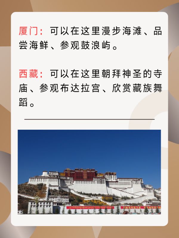 西藏:西藏是一个神秘而美丽的高原,有着壮观的雪山、湖泊和寺庙。你可以在这里朝拜神圣的寺庙、参观布达拉宫、欣赏藏族舞蹈,感受一种深刻的宗教氛围。