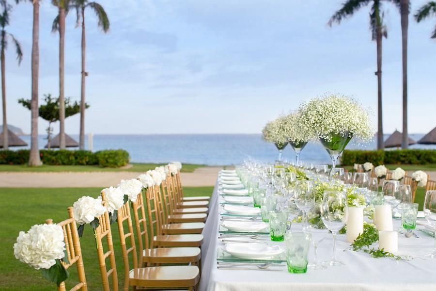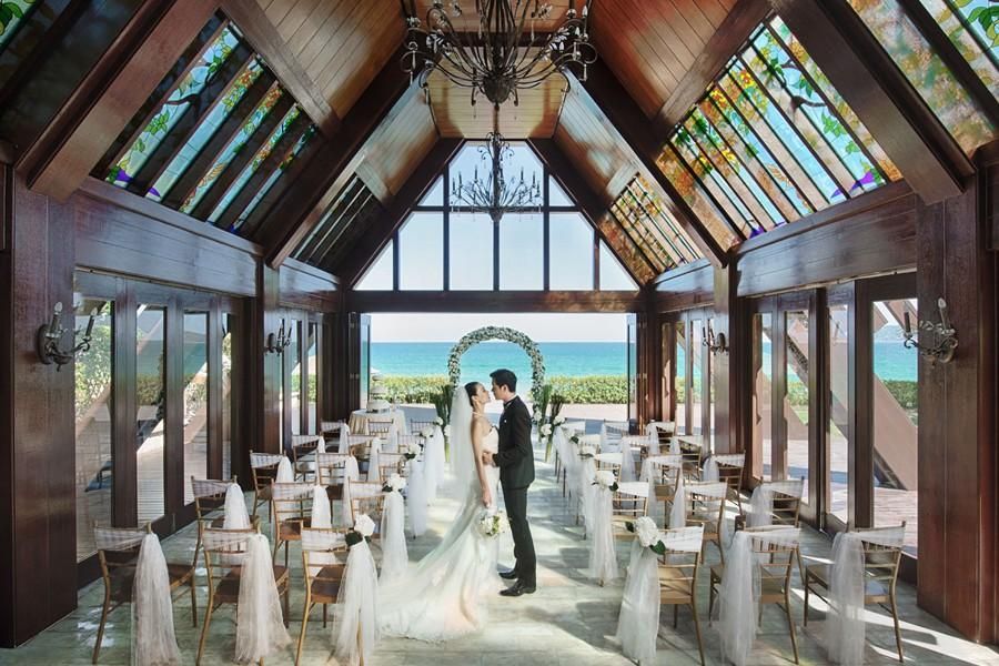 木质尖顶式建筑,全通透的落地窗。婚礼进行时,以海景为背景,以草坪作地毯,涛声伴奏。