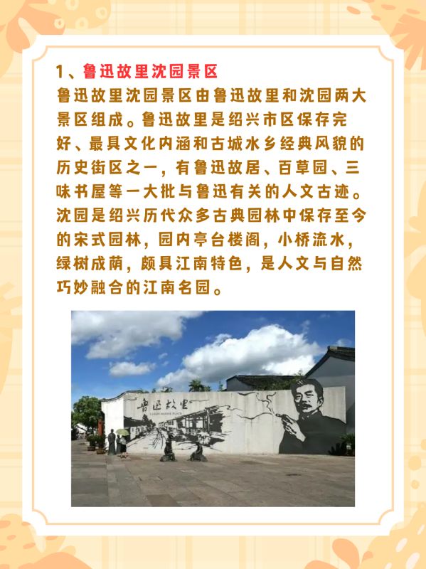 1、鲁迅故里沈园景区:鲁迅故里是绍兴市区保存完好、最具文化内涵和古城水乡经典风貌的历史街区之一,有鲁迅故居、百草园、三味书屋等一大批与鲁迅有关的人文古迹。