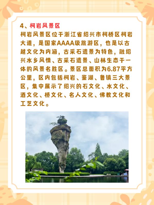 绍兴是一座历史文化名城,拥有众多著名的文化景点,如西湖、柯岩、鲁迅故里等。此外,绍兴还有许多具有独特特色的景点,如诸葛八卦村、东方红酒文化博物馆等。游览这些景点,您可以深入了解中国传统文化,领略江南水乡的风光。来绍兴旅游,不仅可以留下美好的回忆,还可以感受到中国传统文化的博大精深。