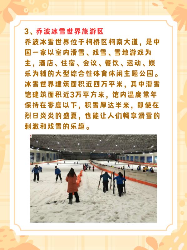 3、乔波冰雪世界旅游区:乔波冰雪世界位于柯桥区柯南大道,是中国一家以室内滑雪、戏雪、雪地游戏为主,酒店、住宿、会议、餐饮、运动、娱乐为辅的大型综合性体育休闲主题公园。