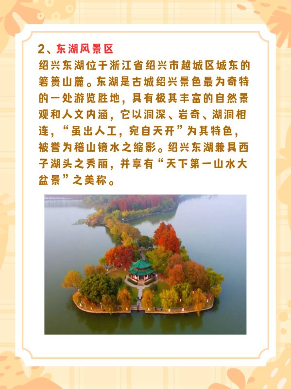 2、东湖风景区:绍兴东湖兼具西子湖头之秀丽,并享有“天下第一山水大盆景”之美称。