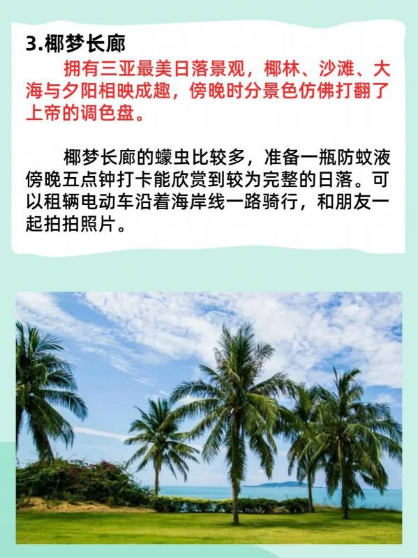椰梦长廊的蠓虫比较多,准备一瓶防蚊液傍晚五点钟打卡能欣赏到较为完整的日落。可以租辆电动车沿着海岸线一路骑行,和朋友一起拍拍照片。