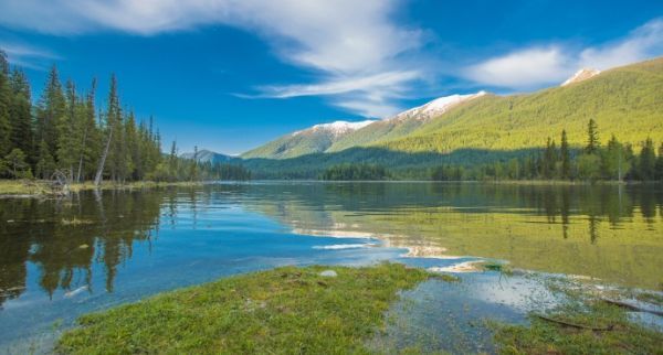 湖四周森林茂密、繁花似锦、绿草如茵,湖中小岛景色秀丽。湖的泄水口有座木桥,站在桥上向北是一平如镜的卧龙湾,向南是奔腾咆哮的喀纳斯河。