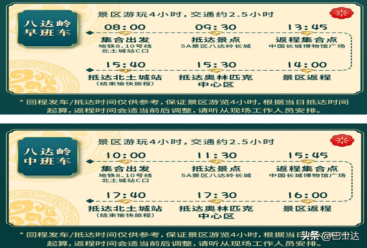 建议游客乘坐巴士达景区专线直通车去八达岭长城和慕田峪长城景区,是因为这种交通方式相对于公交、自驾还有打车性价比更高,它不仅包含了往返的交通作用,还有其他丰富的服务和优惠。巴士达景区专线直通车都为豪华空调旅游大巴,使游客在奔波中也有舒适的体验感。并且,携带行李的游客还可以在游玩时将行李寄存在大巴的行李舱,省事又省心。在路线的选择上,巴士达会将游客直接送到景区检票处,不需要再换乘景区摆渡车,巴士达还选择了靠近高速的地铁口等候游客,接到后尽快上高速公路,减少市区堵车的时间,从而花费较少的时间在交通上。巴士达直通车采取错峰出行的方式,游客不用早起,而且有早、中双班(8点/10点)舒适团可以选择。在景区内游览的时候,巴士达会留够充足的观景时间,全家人能够畅游长城4~5个小时,