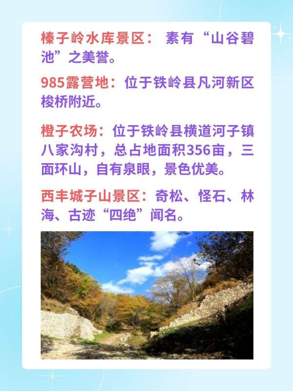 5、铁岭清河旅游度假区:素有辽北明珠之美誉的清河旅游渡假区座落于铁岭市清河区境内,距铁岭市政府所在地40公里,距京哈铁路开原站9公里,距沈哈高速公路开原出入口10公里。