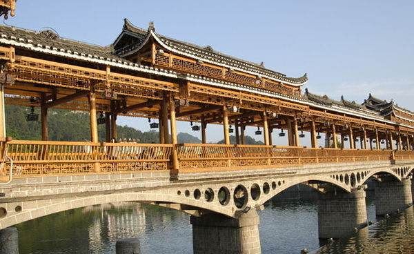 都匀百子桥,建于清乾隆五十一年(1786)因当地唐姓家族筹建也称唐家桥,建于当时城北的剑江河之上,桥长140米,宽8米,高11.5米,结构为七孔石拱桥,因为历史悠久并且多次扩建装饰成为都匀桥的典范。