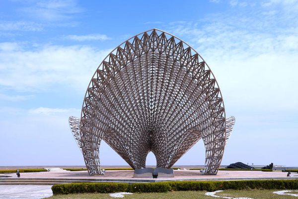 南汇嘴观海公园位于浦东新区南汇新城,往前一步就是东海。公园的标志性雕塑是由不锈钢管构成的双层网架结构,在满天星空下,司南鱼看起来非常壮观。海上还有一排风车阵,伴随着火红的日出,非常梦幻。