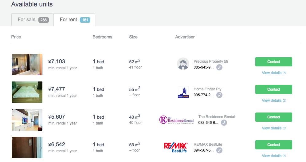 泰国房产网上,某个高层公寓的租金列表,这个公寓的售价约为2.9万元/平(单位:人民币)