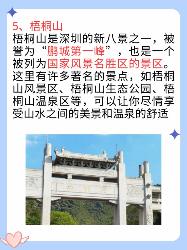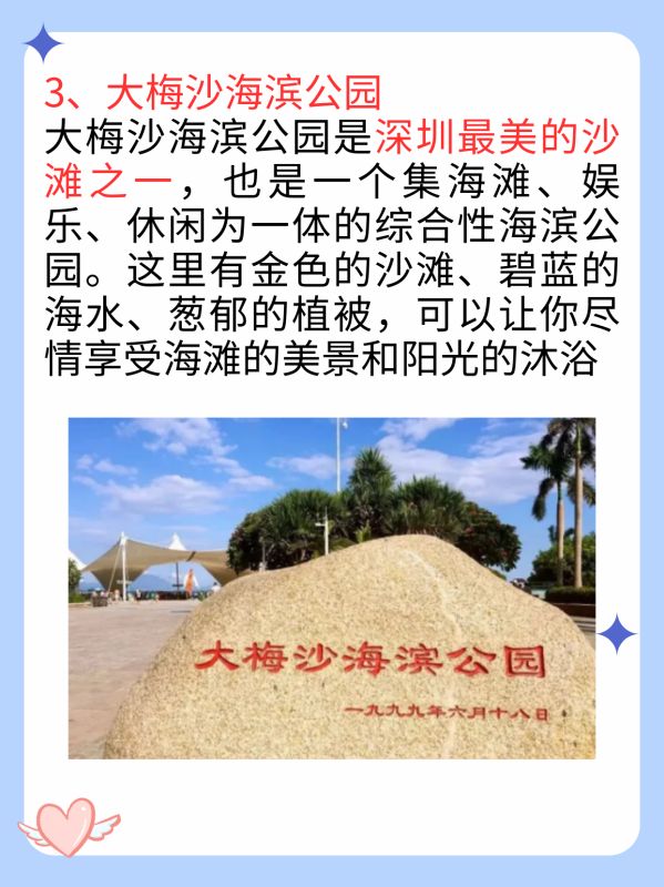 莲花山公园是一个了解深圳历史和文化的好地方,赏花也是一大乐趣。深圳市野生动物园则可以近距离观察到珍贵的野生动物。大梅沙海滨公园则是一个享受海滩美景和阳光沐浴的好去处,还有各种休闲娱乐设施。锦绣中华·民俗村则展示了中国的传统文化和历史,春天赏花更是美不胜收。梧桐山则是登山、观景和泡温泉的好去处。每个景点都有其独特的魅力和乐趣,可以根据你的兴趣和时间安排进行选择。