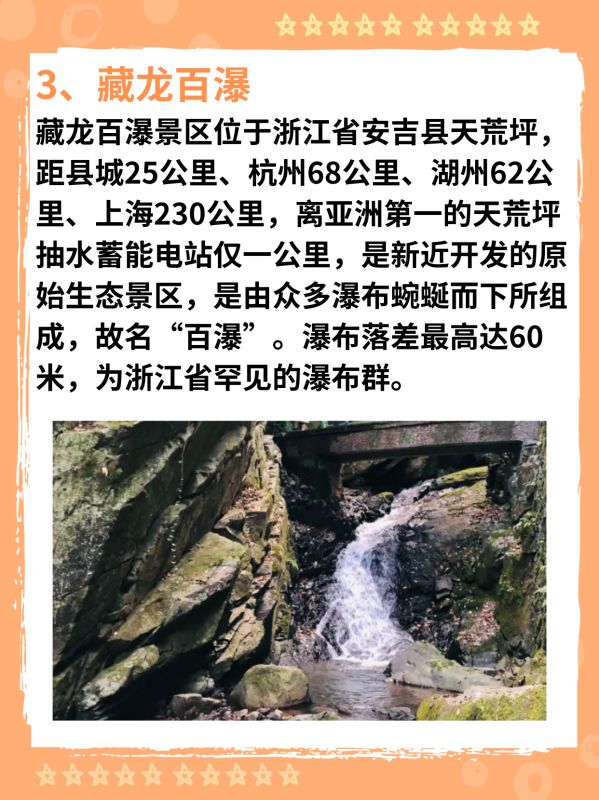 3、藏龙百瀑景区位于浙江省安吉县天荒坪,距县城25公里、杭州68公里、湖州62公里、上海230公里,离亚洲第一的天荒坪抽水蓄能电站仅一公里。