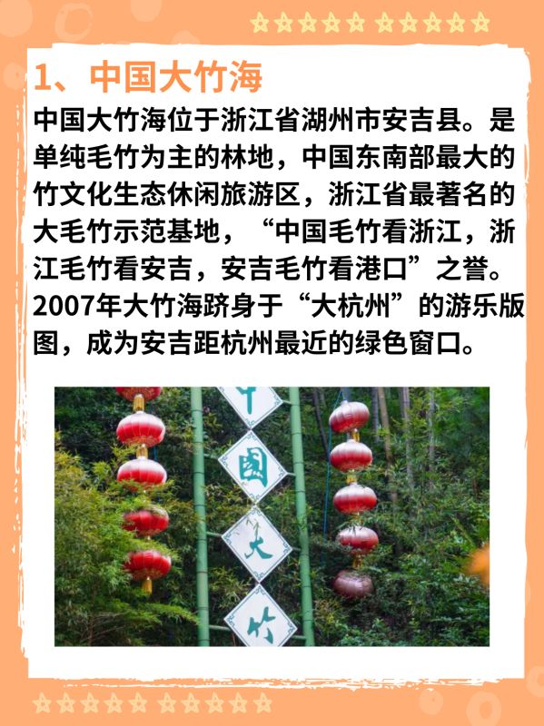 1、中国大竹海位于浙江省湖州市安吉县。是单纯毛竹为主的林地,中国东南部最大的竹文化生态休闲旅游区,浙江省最著名的大毛竹示范基地。