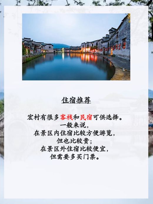 宏村有很多客栈和民宿可供选择,价格从几十元到几百元不等,视季节和位置而定。一般来说,在景区内住宿比较方便游览,但也比较贵;在景区外住宿比较便宜,但需要多买门票。以下是一些住宿推荐: