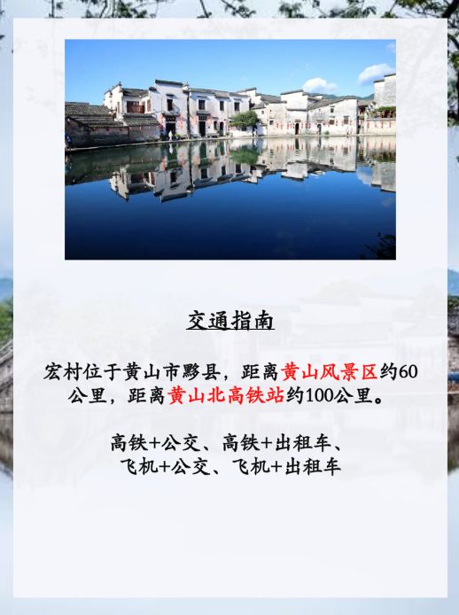 高铁+公交:从黄山北站出发,乘坐K1路公交车到黄山市汽车客运总站(也叫屯溪汽车站),然后乘坐“屯溪-西递-宏村”长途汽车到达宏村,票价17.5元,车程约1.5小时。